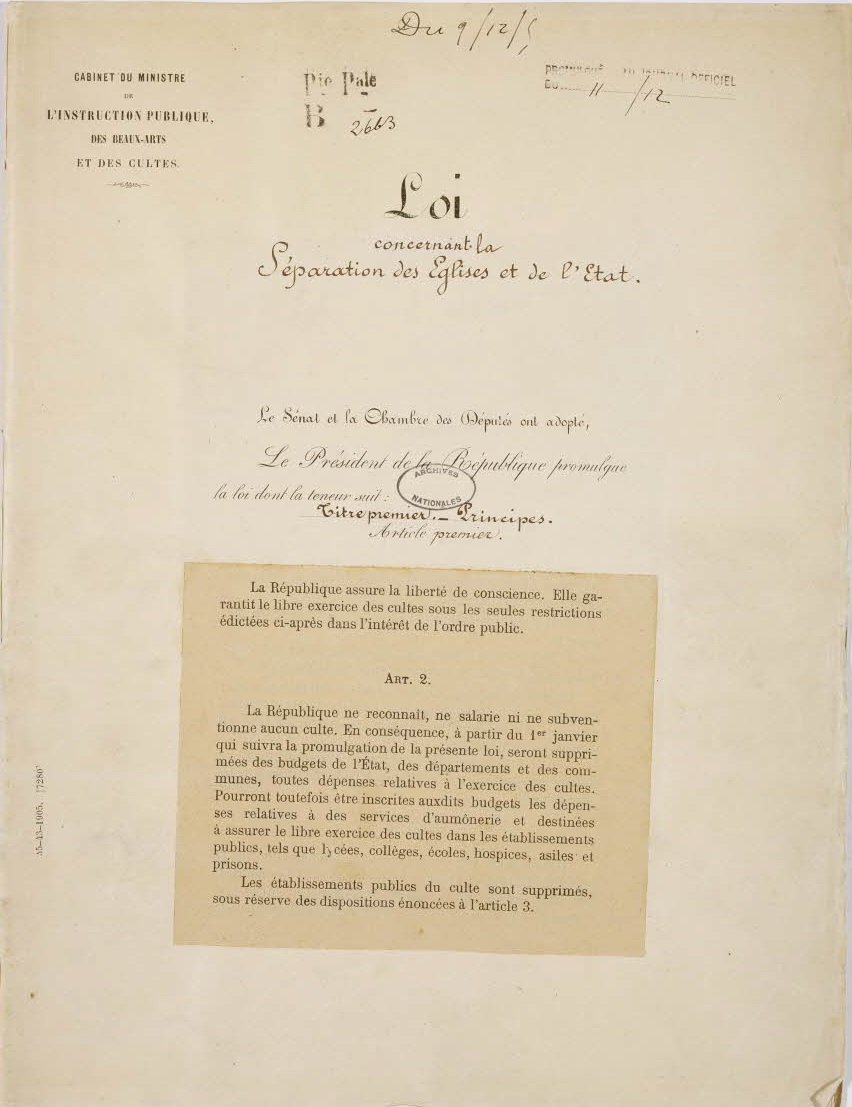 Le 9 décembre 1905, la loi de séparation des Églises et de l’État est promulguée après des débats passionnés tant au Parlement que dans la société civile. Elle met fin au régime concordataire mis en place en 1802 et entérine la sécularisation de la République, qui « ne reconnaît, ne salarie ni ne subventionne aucun culte ». Cette loi acte le principe de neutralité de l’État vis-à-vis des religions et en garantit le libre exercice. Elle ne s’applique ni aux départements d’Alsace-Moselle, réunis à la France en 1918, ni en Guyane, à Mayotte et dans les autres collectivités territoriales d'outre-mer.« La République assure la liberté de conscience. Elle garantit le libre exercice des cultes (…) La République ne reconnaît, ne salarie ni ne subventionne aucun culte » : c’est par ces mots que s’ouvre la célèbre loi du 9 décembre 1905 concernant la séparation des Églises et de l’État. Cette loi met fin au régime concordataire mis en place par Napoléon Bonaparte en 1802, qui reconnaissait le catholicisme comme « religion de la grande majorité des citoyens français » et imposait la nomination par le gouvernement des ministres des différents cultes (catholique, réformé, luthérien, israélite). Le Concordat abolissait ainsi la première séparation des cultes et de l’État mise en place en 1794 par la Convention nationale.