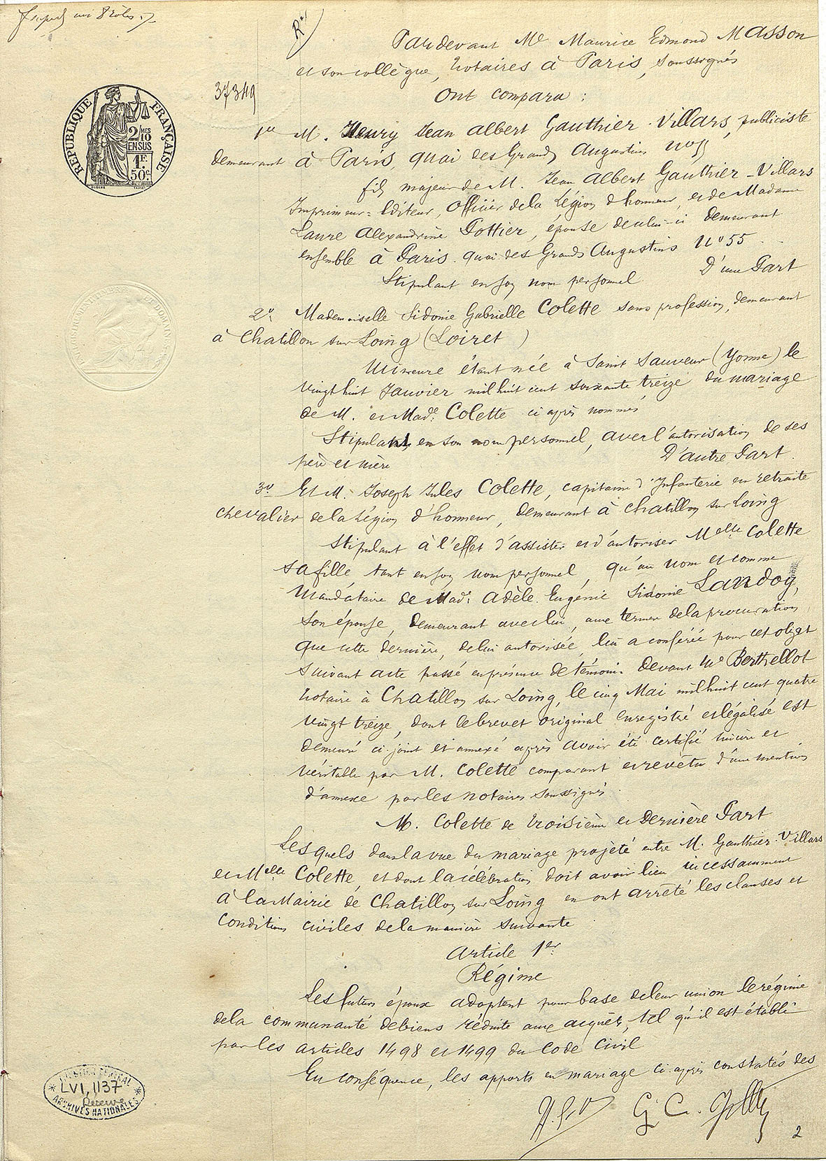 À tout juste vingt ans, Gabrielle Colette épouse Henry Gauthier-Villars, dit Willy. Le contrat de mariage, conservé aux Archives nationales, marque l’entrée de la jeune femme dans le Paris littéraire. Willy devient son passeur — et son censeur. Sous son autorité, Colette écrit, mais signe peu : les premiers succès, la série des Claudine, paraissent sous le seul nom de Willy.