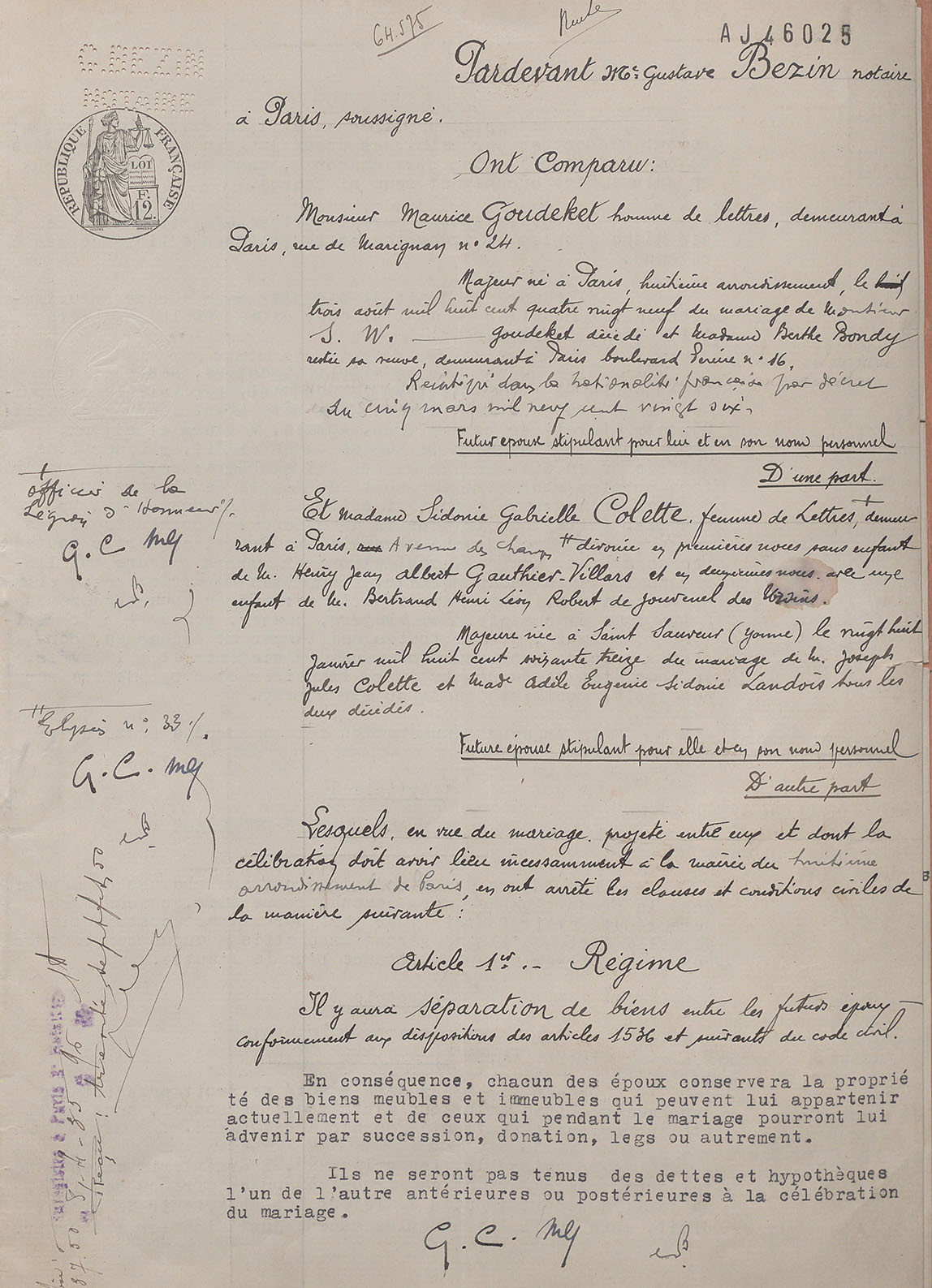 Les Archives nationales conservent notamment les contrats de ses mariages successifs, dont celui conclu avec Maurice Goudeket en 1935. Ces documents, d’une précision implacable, révèlent une femme attentive à son indépendance juridique et financière, jusque dans l’intimité.
