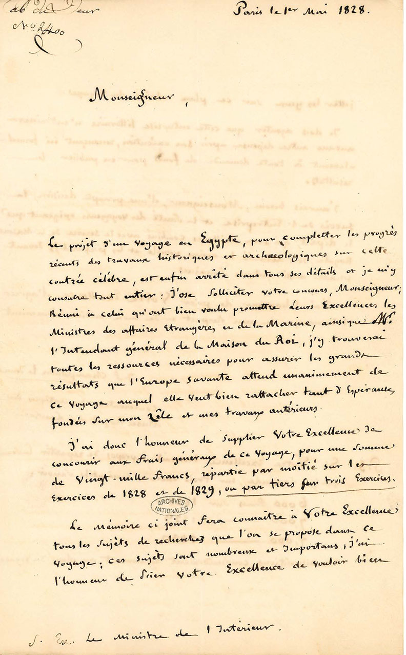 Demande de financement de Jean-François Champollion au ministre de l'Intérieur pour son projet de « Voyage littéraire et scientifique en Égypte », 1er mai 1828
