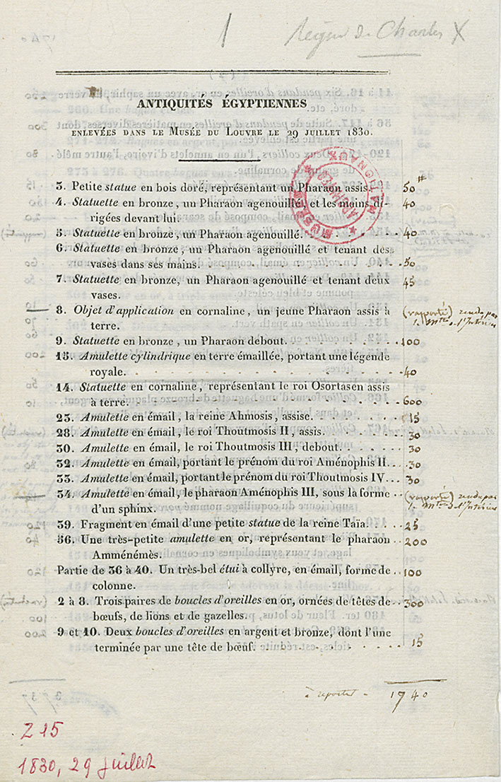 Mais en juillet 1830, les journées révolutionnaires qui renversent Charles X mettent en péril son œuvre : le Louvre est pillé. Une liste d’antiquités égyptiennes volées, annotée par Dubois, dessinateur du département égyptien, recense les objets disparus. Certains avaient été rapportés par Champollion lors de son expédition en Égypte (1828-1829).