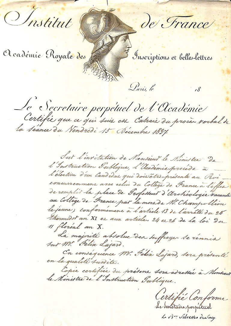 Extrait du procès-verbal de l'Académie des inscriptions et belles-lettres du 15 novembre 1837 rappelant l'élection du successeur de Champollion à la chaire l'égyptologie du collège de France. Archives nationales de France, F/17/13556