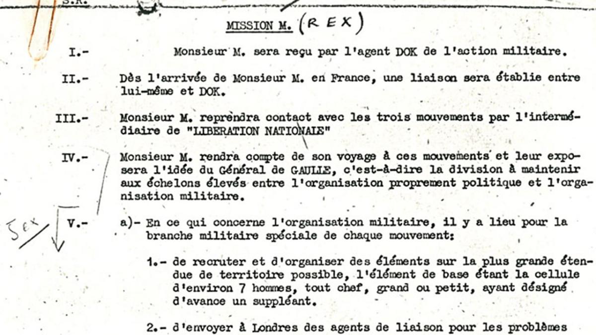 Dans la nuit du 1er au 2 janvier 1942, Jean Moulin, devenu Rex – les pseudos des chefs de mission sont alors composés de trois lettres –, est parachuté en Provence comme représentant en zone sud du général de Gaulle. Au-delà de son aspect militaire (création d'une armée secrète), sa mission est aussi politique, en vertu d'un second ordre de mission du 24 décembre 1941 : fédérer les mouvements et les placer sous l'autorité du général de Gaulle, en leur fournissant les moyens de financer leurs actions.