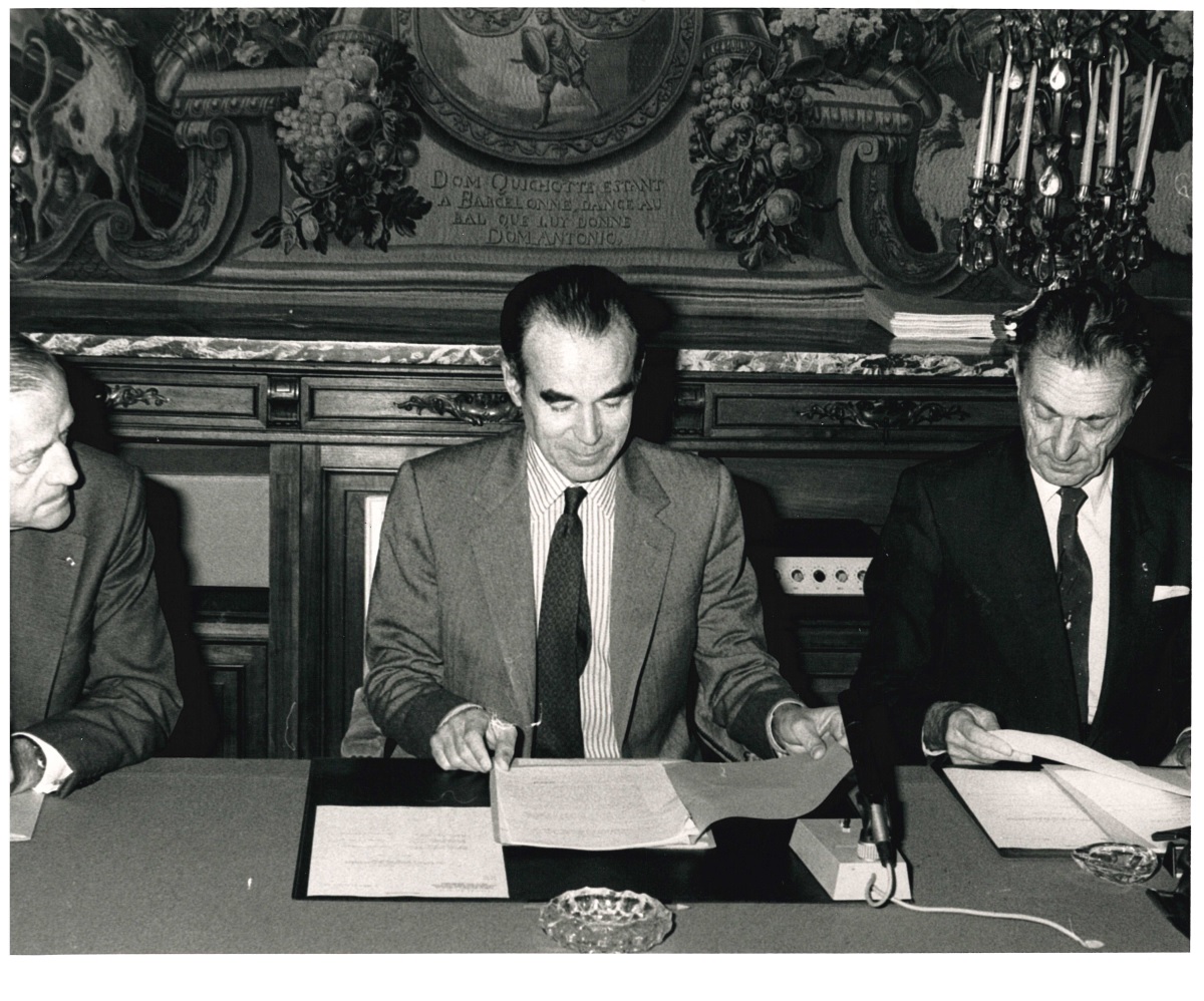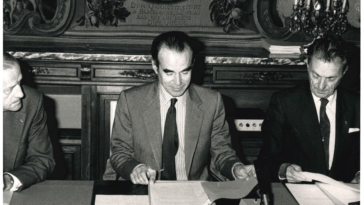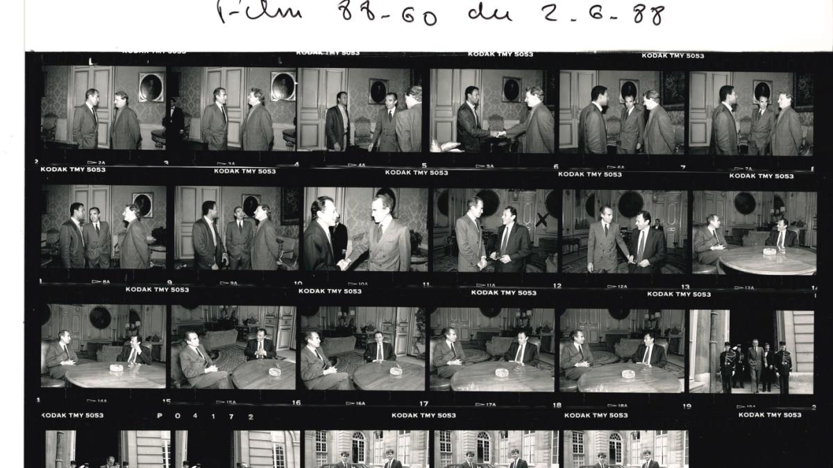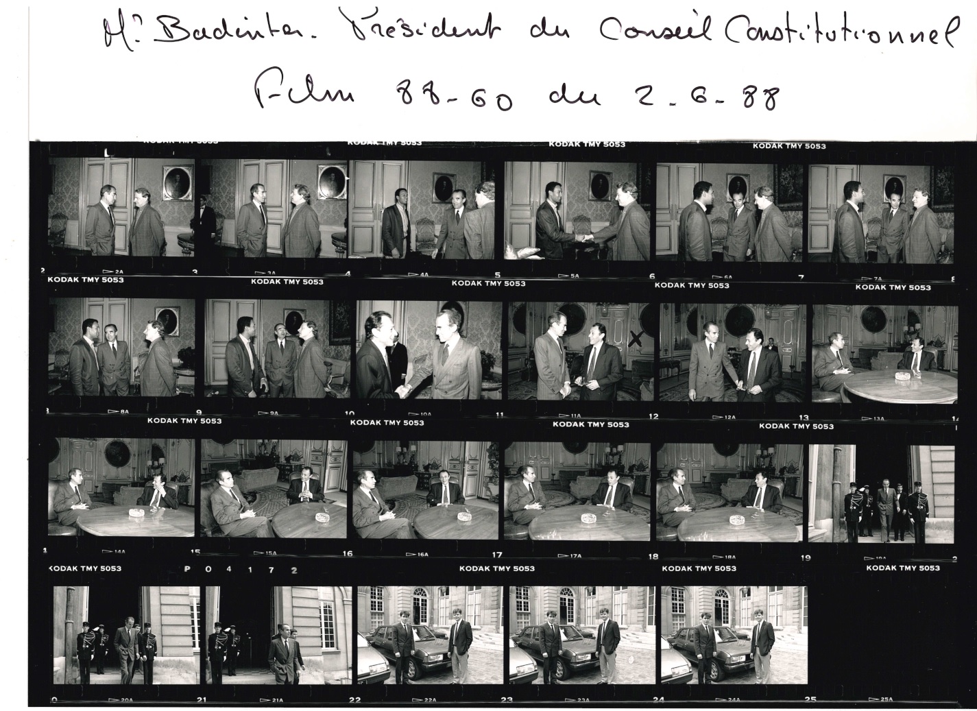 Le 19 février 1986, Robert Badinter quitte la Chancellerie pour la présidence du Conseil constitutionnel. Son discours de prise de fonction est conservé dans les fonds des Archives nationales. Une série de photos, prise par le service de communication du Premier ministre, le montre échangeant avec son Michel Rocard, alors premier ministre, en juin 1988. Il ne se désengage pas pour autant des combats qu’il a menés jusqu’à cette date, mais les porte désormais au plan international, et dans d’autres lieux que les prétoires. Européen convaincu, partisan de la paix, il préside ainsi la Commission d’arbitrage pour la paix en Yougoslavie, dite « Commission Badinter », créée en 1991, et dont on trouve trace dans les archives présidentielles. Il anime également durant plusieurs années avec Michelle Perrot [dont les archives ont été confiées aux Archives nationales], un séminaire à l’EHESS sur la prison, dans la lignée des travaux de Michel Foucault, et publie la Prison républicaine (1871-1914) en 1992.